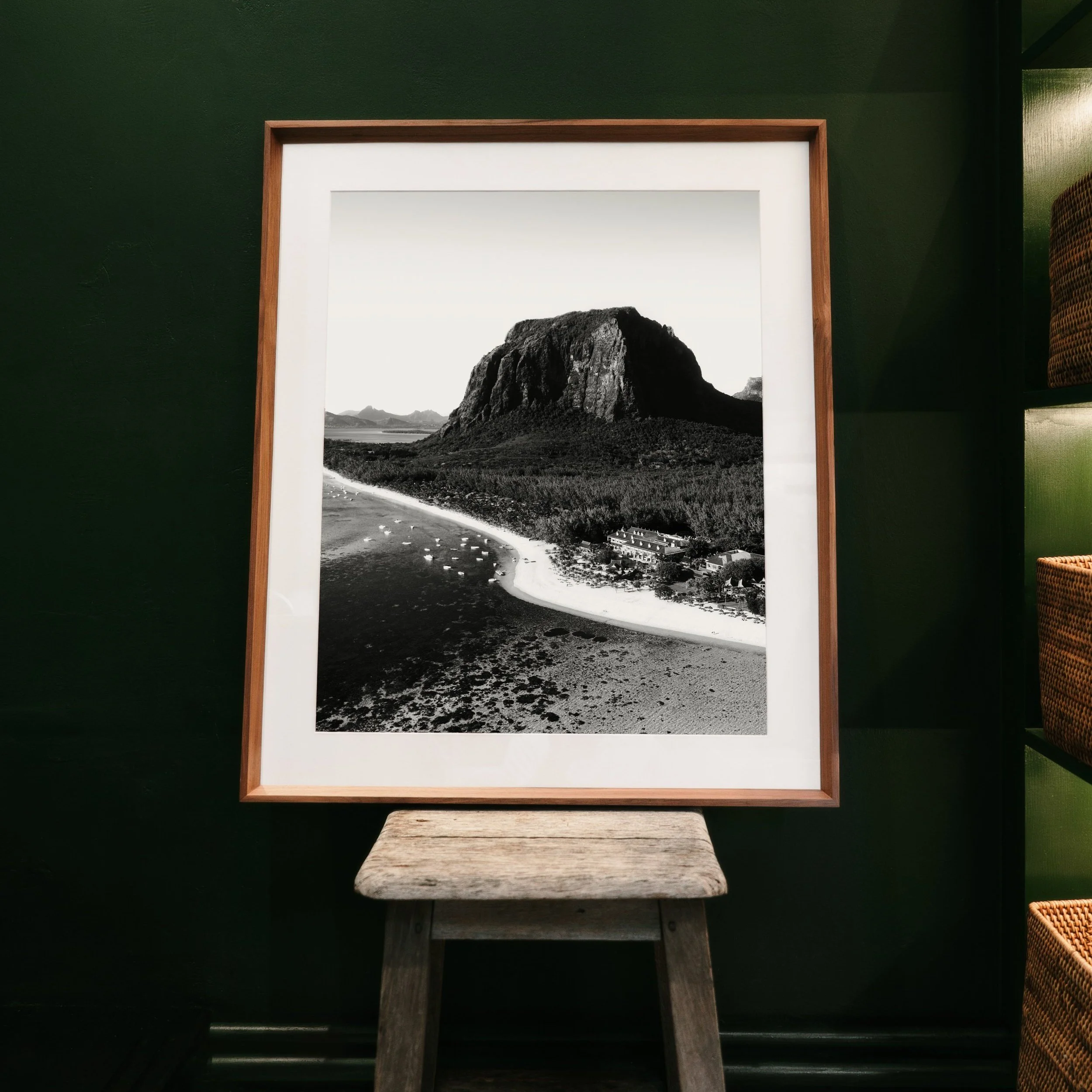 The first print I released here in Mauritius, an aerial view of the iconic Le Morne mountain, framed in beautiful walnut.